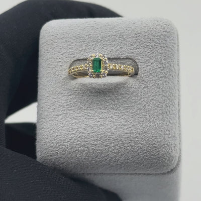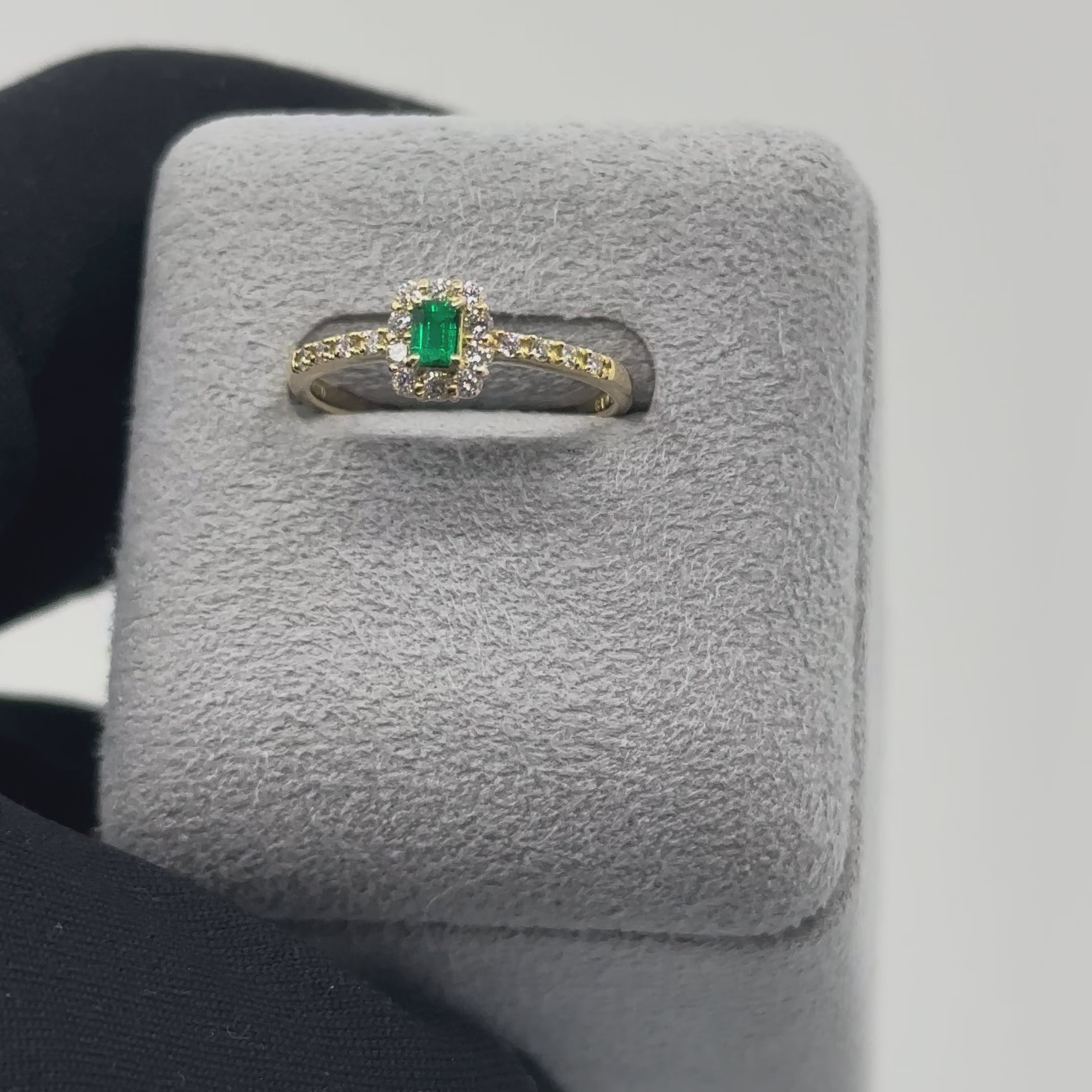 スクエアでやや細長いエメラルドをセンターに配した一点物リング。全体は小ぶりなサイズです。抜け感があり、日常使いしやすいバランスです。色味は標準的に濃いトーン。内包物は見えにくい状態。照りがあり、透け感があります。そのため、他の個体よりやや薄く見える場合がありますが、基準としては濃い部類です。